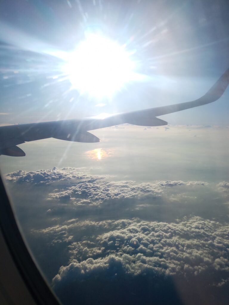 翼の下あたりの方角の地上にピカピカ光る何かが見えてました。多分、夕陽または太陽光に反射してる地上の建物や池のようです。