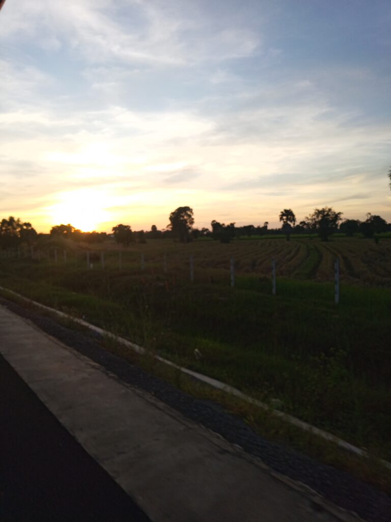 シエムリアップ空港から出発してトゥクトゥク走行中の画像です。夕陽がきれいです。トゥクトゥクのお兄さんはずーとハイテンションで嬉しそうでした。20USDはいい稼ぎかな?空港出るときに周りにたむろしてるトゥクトゥクの運転手たちとも声を掛け合ってました。「やったぞー!カモ捕まえた!」「よくやった!」的に聞こえました。