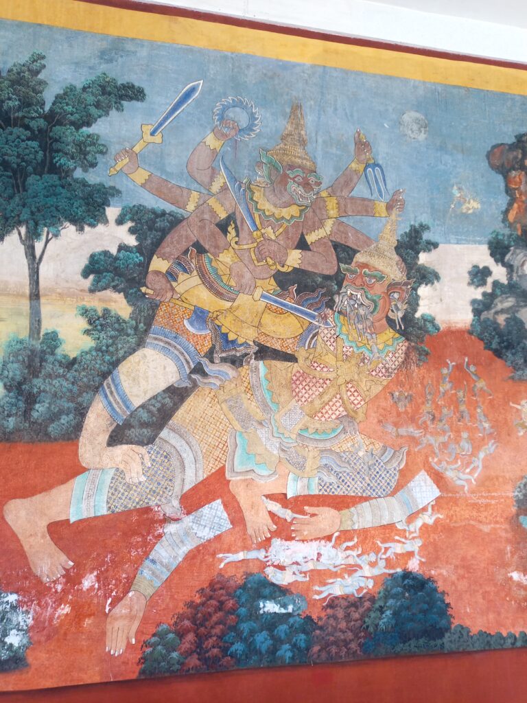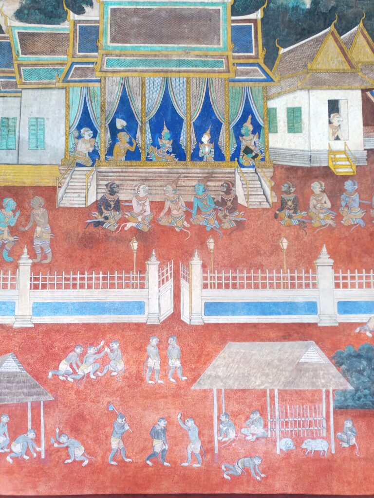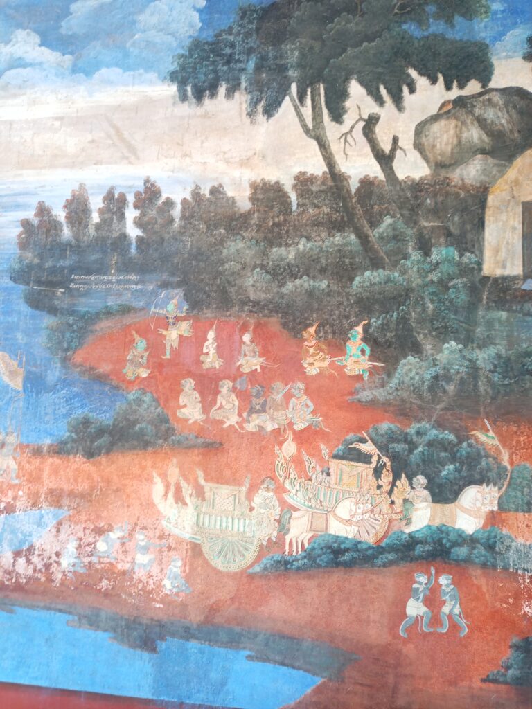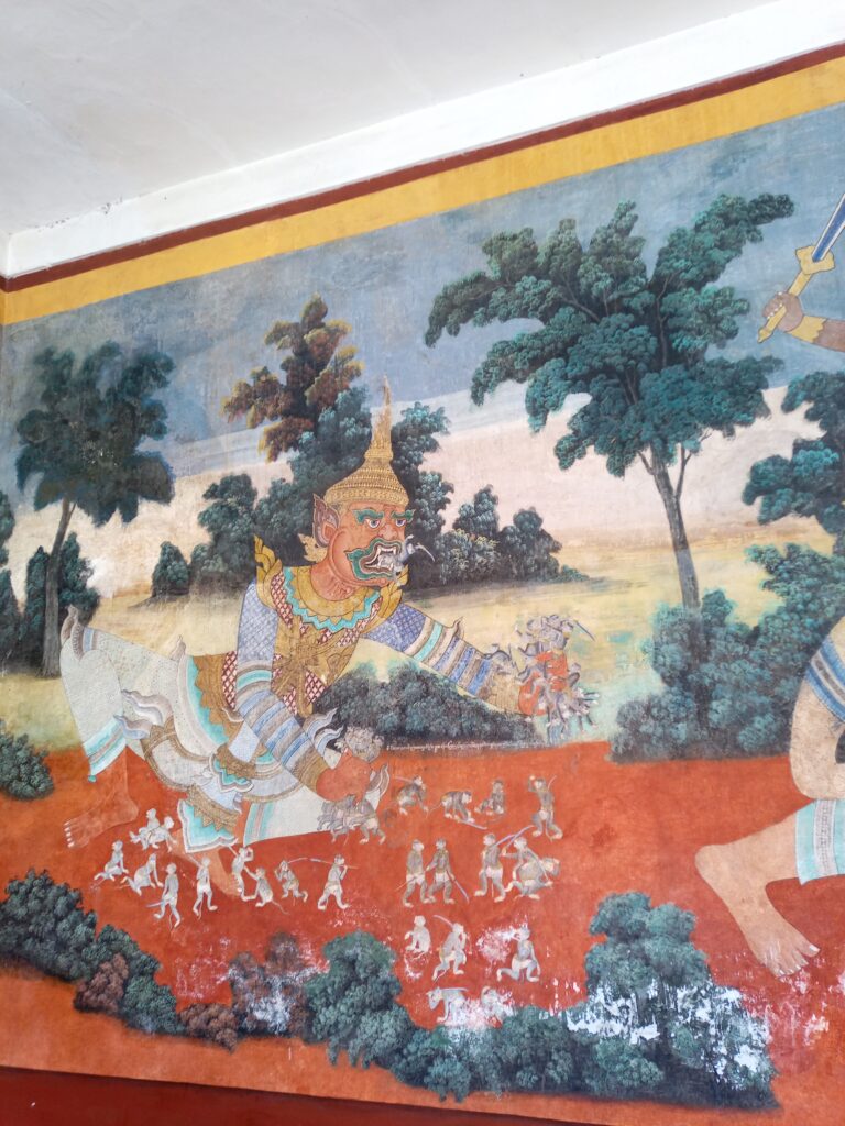 東南アジアヒンディー圏あるあるのラーマヤーナの壁画が美しい。