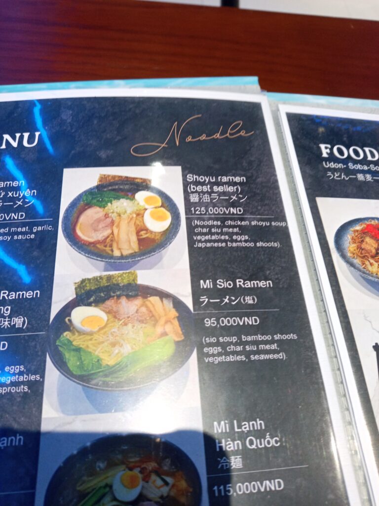 醤油ラーメン125000VND=800円くらいかな。ママは日本で働いたことある女性。日本語かなりわかる。ラーメンは札幌なら中ぐらいの味かな。ベトナムでこんなおいしいラーメン食べれるとは感激。