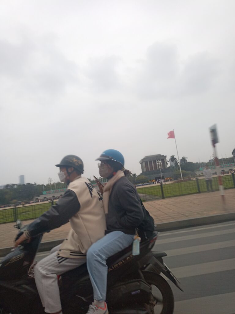 撮ったのはバイクのアベックではなく、遠くに見えるホーチミン廟。ホーおじさんのお墓です。下にたくさんの方々が並んでいるのが見えます。午前10時ころ。