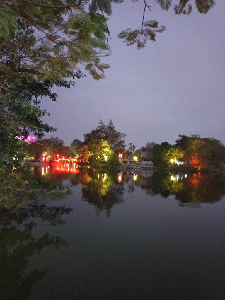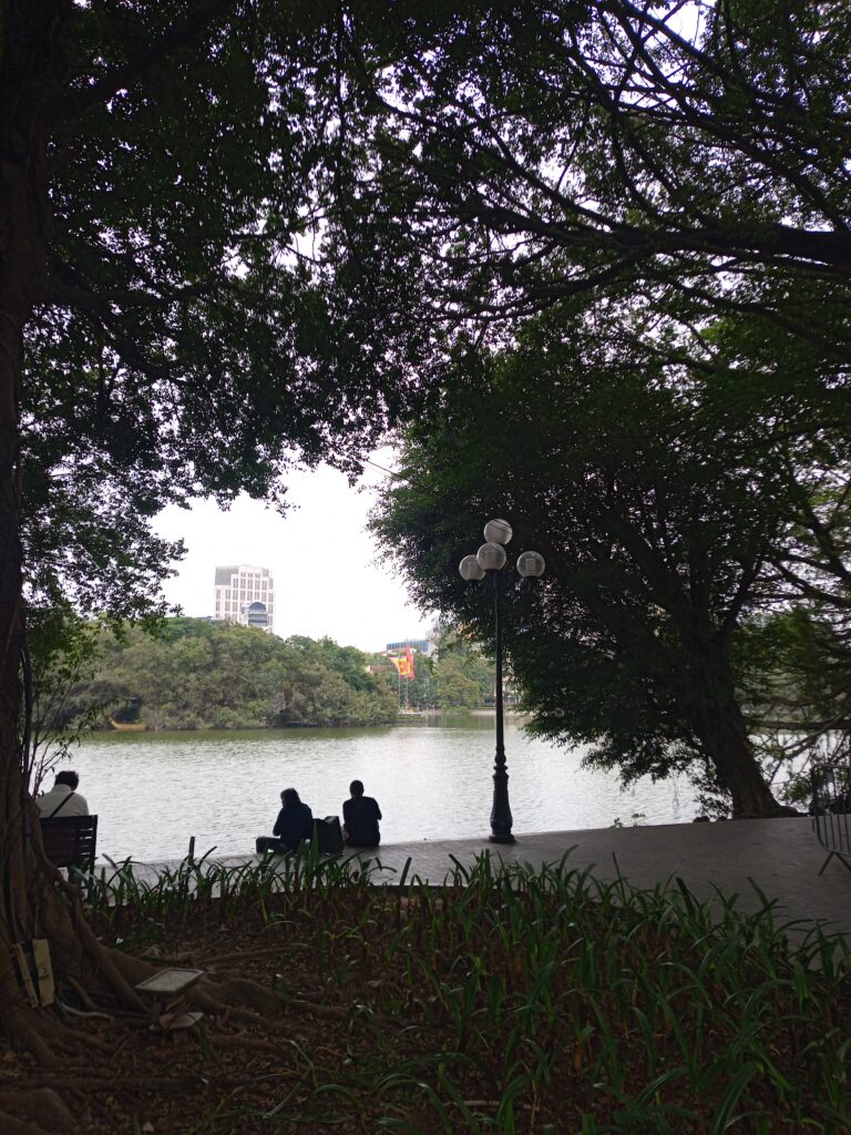 とぼとぼ歩いてホアンキエム湖のほとりに着きました。表記は湖ですが日本人の感覚では池です。札幌の中島公園か東京の井の頭公園みたいな雰囲気。市民の憩いの場という感じ。